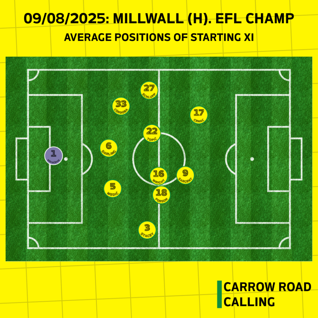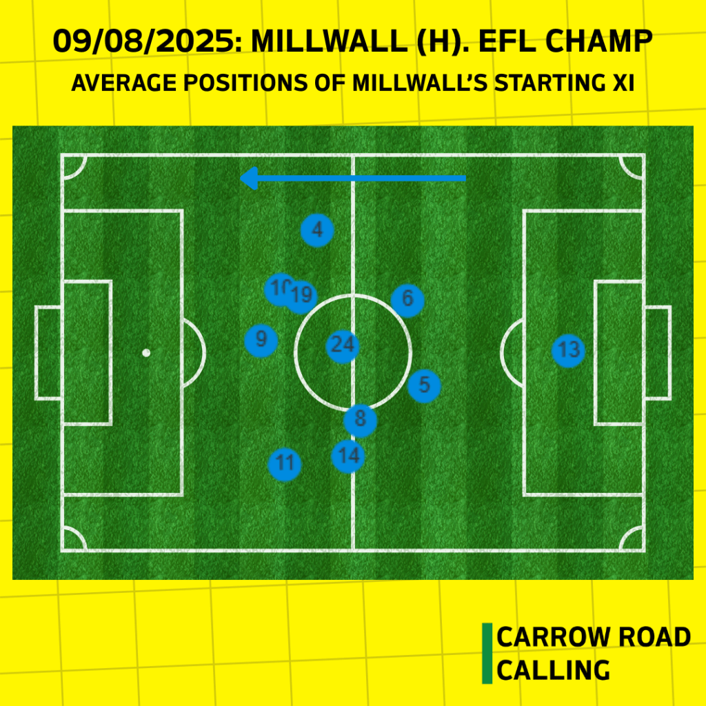 The contrast with Millwall’s average positions illustrates the point. Whilst their base formation was a 4-2-3-1, their two full backs (#4 Tristan Crama and #14 Alfie Doughty) were able to get higher up the pitch than our wing-backs did.